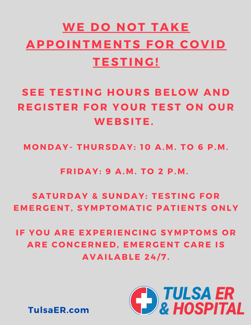 Call Tulsa ER and Hospital Today. Officials said normal testing hours.